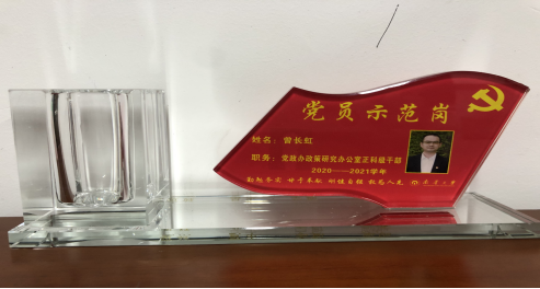 2020年12月23日,经PA视讯平台机关党委评选通过,曾长虹同志设立为2020-2021年度机关党员示范岗。
