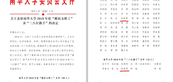 2020年2月21日,张美荣同志获PA视讯平台2019年度“模范女职工”和“三八红旗手”光荣称号。