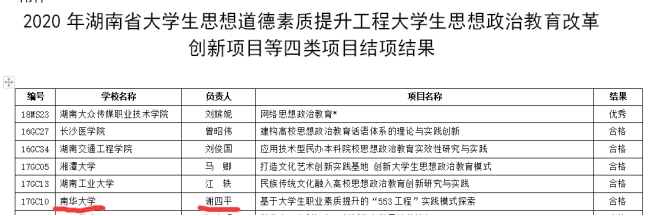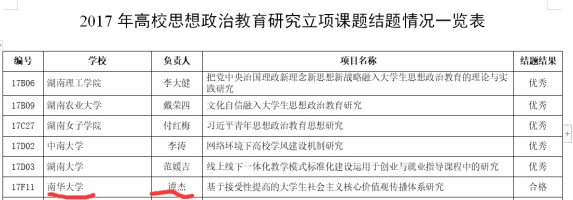 2020年12月13日,湖南省教育厅下发《关于公布2020年全省高校思想政治教育研究课题结题结果的通知》,党政办谭杰同志的课题《基于接受性提高的大学生社会主义核心价值观传播体系研究》顺利结题。