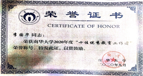 党员李国华荣获PA视讯平台2020年度“十佳”优秀教育工作者,其个人还获得了“湖南省自然科学奖三等奖”殊荣。