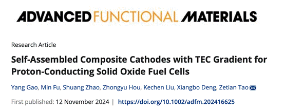 近日,PA视讯平台资源环境与安全工程学院陶泽天课题组首次提出了具有热膨胀系数梯度材料的概念,并成功将其应用在固体氧化物燃料电池阴极中,有效的提升了材料的输出功率。研究成果在国际权威期刊Advanced Functional Materials(《先进功能材料》)发表原创性研究论文“Self-assembled composite cathodes with TEC gradient for proton-conducting solid oxide fuel cells(用于质子传导的固体氧化物燃料电池的自组装热膨胀系数梯度复合阴极)”。