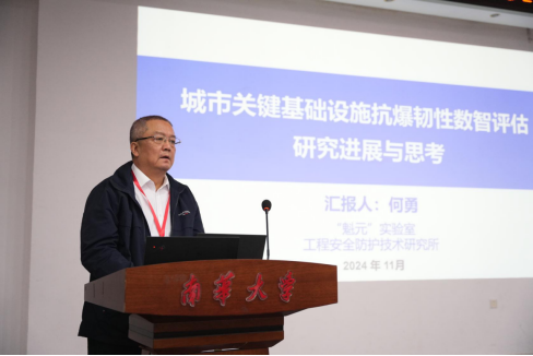 在随后进行的论坛主旨报告环节,聂建国院士、南京理工大学副校长何勇教授分别以“科技创新成就绿色低碳土木工程”“城市关键基础设施抗暴韧性数智评估进展与思考”为题作主题报告。聂建国院士用丰富的工程现场案例及数据,全面展示科技创新赋能绿色建筑结构的重要性,并强调只有坚持不唯书、不唯上、不唯洋、不唯他、只唯实,才能用科技创新成就绿色低碳土木工程。何勇教授从研究背景与意义、数物驱动智能计算方法、单体设施爆炸毁伤数智评估、设施体系抗暴韧性数智评估等方面全面介绍了城市关键基础设施抗暴韧性数智评估的研究进展。海军研究院海防工程设计研究所研究员、全国勘察设计大师王建平主持主旨报告会。