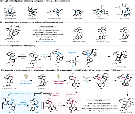天然产物长期以来一直是药物发现的重要来源。具有复杂空间结构、生物活性显著的分子,尤其是人们关注的热点。天然产物分子结构中连续季碳立体中心(CQS)的存在显著增加了分子的复杂性和多样性,而特殊的空间结构往往会表现特别的生物活性。然而,连续季碳立体中心的构建,尤其是当存在于多元并环和桥环复杂结构中时,是天然产物全合成中最具挑战性的难题之一。该策略展示了光诱导Diels-Alder反应构建多个连续季碳立体中心的优势,为其他复杂天然产物,特别是对于含有多个连续季碳立体中心的分子的合成提供了新的思路,展示了其在相关天然产物全合成中的广泛应用前景。