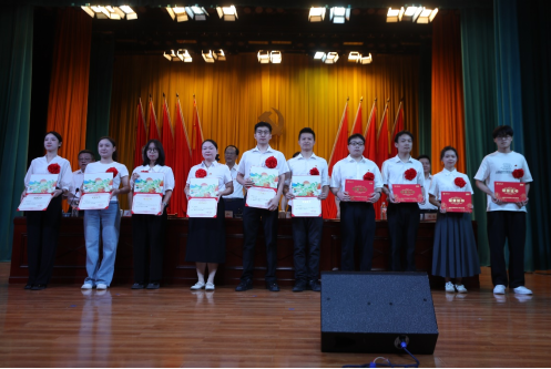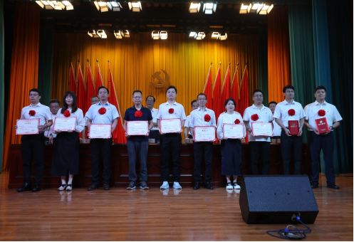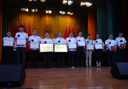 夏昆宣读受表彰名单。在主席台就坐的校领导为全国、湖南省“双带头人”教师党支部,湖南省第四批高校党建工作标杆院系、样板支部,湖南省高校教师党支部书记“双带头人标兵”,湖南省高校党务工作示范岗、青年教工党员示范岗等表彰对象颁发了奖牌或荣誉证书。