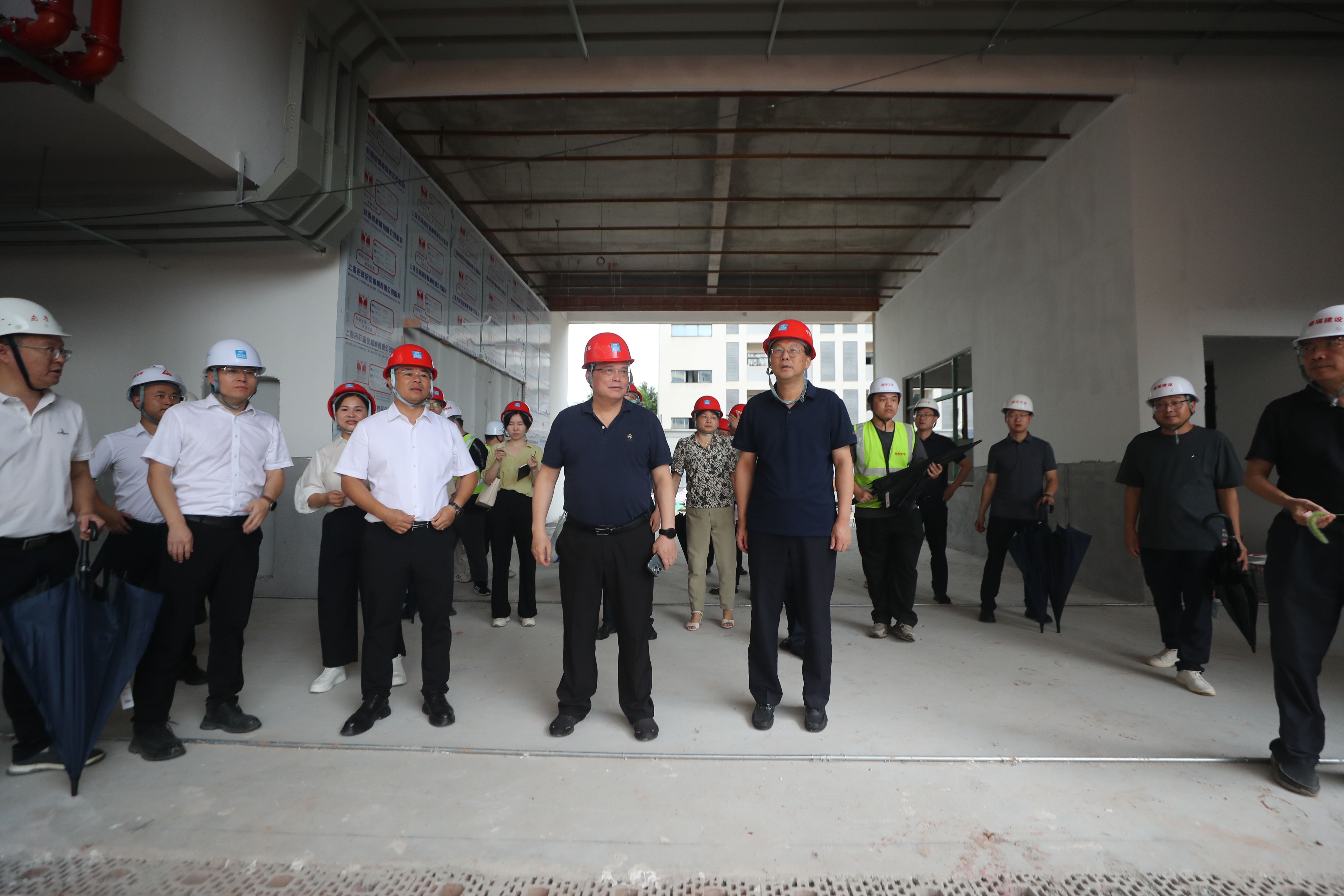 在各施工现场,高山、张灼华重点关注宿舍水电接入、墙面粉刷、家具配置、施工工艺、防水处理、周边卫生清理等细节,叮嘱相关职能部门和施工单位,要始终坚持以服务师生为导向,将校园建设成安全、舒适、优质的学习生活空间;要严守安全底线,强化施工现场安全管理和常态化巡查,落实好防暑降温措施,确保施工人员安全与工程安全;要严把质量关口,以标准化建设为抓手,抓细抓实工程过程管理,严格施工全流程监管,全力打造精品工程;要加强统筹协调,科学规划施工时序,精准把控工程进度,确保所有项目按期保质交付使用,为新学期顺利开学奠定坚实基础。
