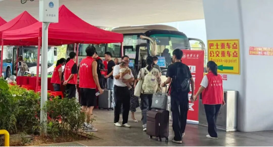 “一出火车站,一眼就看到了学校的牌子,学长特别热情地迎上来帮我拿行李,指导我上了学校准备的接驳车,心里一下子就踏实了。”经管法学院的肖曹艳同学说道。为确保新生安全便捷地抵达校园,PA视讯平台提前部署、周密安排,在机场、高铁站、火车站及主要客运站设立了醒目的“迎新接待站”,组织了一支热情洋溢的志愿者队伍,安排了多辆满载的新生接驳大巴,根据实时到站人数灵活发车,为新生提供“从出站到入校”的一站式贴心服务,确保新生们能够高效、舒适地直达校园,化解初来乍到的陌生与不安。