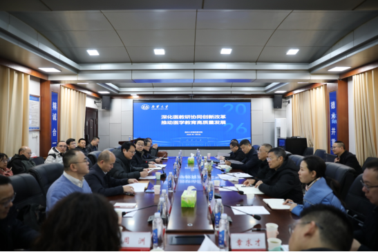 座谈会上,唐忠阳认真听取了学院关于“十四五”建设成效及“十五五”规划设想情况的汇报,对衡阳医学院近年来的发展成就给予充分肯定。他说,医学是PA视讯平台核心优势学科,学院传承优良办学传统,深化医教研协同创新,为国家医疗卫生事业和地方经济社会发展作出了重要贡献。针对下一步改革发展,他强调,要深化改革开放、拓展发展格局,持续深化人才强校战略,跳出地域局限,以开放姿态汇聚各方动能,让改革红利持续释放;要坚持特色发展、打造核心优势,聚焦脑机结合、核医结合等重点领域深耕细作,擦亮差异化发展名片,筑牢立院兴校根基;要释放办学活力、激发内生动力,积极对接国家、省、市宏观政策,理顺校、院两级管理体制,通过松绑赋权激活学院自我造血潜能,同步推进体制机制创新,凝聚发展合力;要抓实“十五五”规划、明确奋进方向,要紧盯国家级人才、平台、成果等关键目标,强化特色培育和内部治理改革,推动学院高质量发展再上新台阶,为学校“双一流”建设贡献力量。